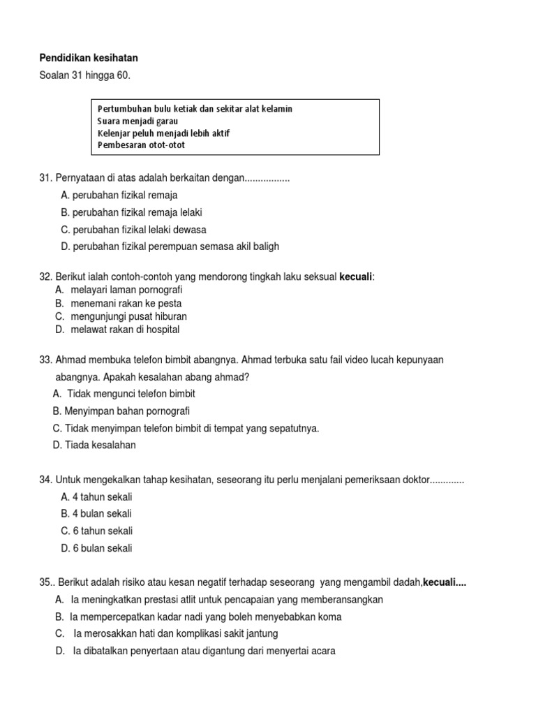Dalam setiap bahagian ini tentu anda tidak dapat menduga soalan yang bakal ditanya. CONTOH SOALAN DAN JAWAPAN PENDIDIKAN KESIHATAN BAHAGIAN A SOALAN 1 Apakah tujuan doktor perubatan atau doktor pergigian melakukan pemeriksaan fizikal terhadap pesakit. Saya tidak peduli jika kawan saya gagal.